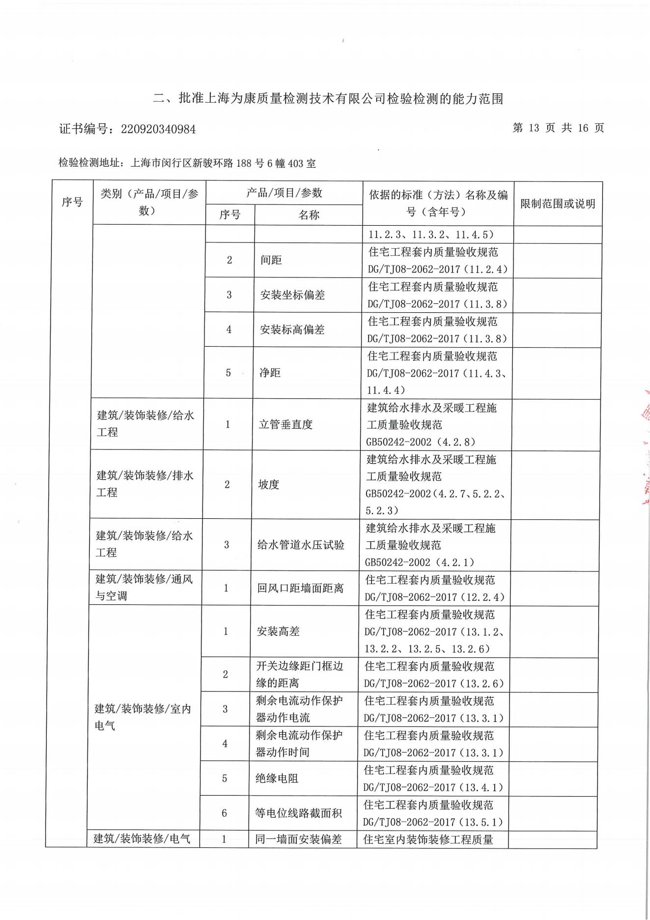 分戶驗收要求 分戶驗收:即交房前依照相關(guān)標(biāo)準(zhǔn)對區(qū)域內(nèi)住宅逐套進行驗收。自2009年10月1日起所有上海市住宅工程強制實施分戶驗收。《上海市工程質(zhì)量分戶驗收管理規(guī)定》住宅工程竣工驗收前必須依照《住宅工程套內(nèi)質(zhì)量驗收規(guī)范》DG/TJ08-2062-2009和現(xiàn)行工程質(zhì)量標(biāo)準(zhǔn)、規(guī)范,對每戶套內(nèi)的觀感質(zhì)量、使用功能及使用安全進行驗收。凡未實施分戶驗收的,該工程項目將不得交付使用;服務(wù)范圍 一、裝修房全過程跟蹤檢查:從毛坯到裝修結(jié)束全過程跟蹤檢驗;對隱蔽工程施工進行檢測;對裝飾 材料進行控制;每個施工節(jié)點作好原始記錄并提出整改意見;待整改結(jié)束進行復(fù)查,直至符合 要求;最終每戶出具一份檢測報告。 二、裝修房竣工驗收:主要對安全、使用功能及表面觀感質(zhì)量進行檢測;每個施工節(jié)點作好原始記錄并提出整改意見;待整改結(jié)束進行復(fù)查,直至符合要求;最終每戶出具一份檢測報告。 三、毛坯竣工驗收:主要對安全、使用功能及表面觀感質(zhì)量進行檢測;每個施工節(jié)點作好原始記錄并提出整改意見;待整改結(jié)束進行復(fù)查,直至符合要求;最終每戶出具一份檢測報告。 四、個人交房驗房檢測。 建設(shè)工程分戶驗收檢測參考標(biāo)準(zhǔn) DG/TJ08-2062-2017 《住宅工程套內(nèi)質(zhì)量驗收規(guī)范 》 DB/T 31/30-2003《住宅裝飾裝修驗收標(biāo)準(zhǔn)》 GB50209-2002《建筑地面工程施工質(zhì)量驗收規(guī)范》 GB50210-2001《建筑裝飾裝修工程質(zhì)量驗收規(guī)范》 GB20242-2002《建筑給排水及采暖工程施工質(zhì)量驗收規(guī)范》 GB50300-2001《建筑工程施工質(zhì)量驗收統(tǒng)一標(biāo)準(zhǔn)》 GB50303-2002《建筑電氣工程施工質(zhì)量驗收規(guī)范》 套內(nèi)質(zhì)量檢測(一房一驗)內(nèi)容 檢測內(nèi)容 建筑尺寸 室內(nèi)地面:水泥砂漿地面、木、竹地板,板塊地面 室內(nèi)頂棚:頂棚抹灰、吊頂工程 室內(nèi)墻面:墻面抹灰、飾面板(磚)墻面、涂飾工程、裱糊工程、軟包工程 建筑門窗 樓梯與護欄 細部工程:櫥、柜,窗簾盒、窗臺板、門窗套、可折裝式隔斷、淋浴房 給排水與燃氣:室內(nèi)給水、室內(nèi)排水、衛(wèi)生器具、燃氣管道 通風(fēng)與空調(diào):送排風(fēng)和防排煙、空調(diào)工程、 室內(nèi)電氣:燈具安裝、開關(guān)、插座,分戶配電箱、室內(nèi)配線、等電位聯(lián)結(jié) 弱電工程:有線電視安裝工程、電話、信息網(wǎng)絡(luò)安裝工程,訪客對講安裝工程、安防報警系統(tǒng) 太陽能熱水系統(tǒng) 室內(nèi)環(huán)境評價